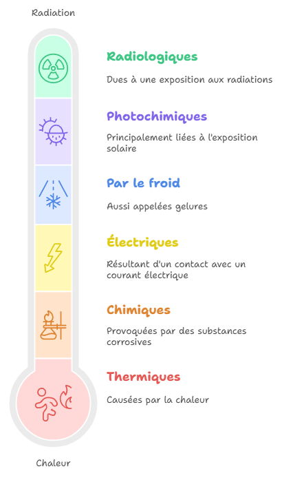 • Thermiques: causées par la chaleur (flammes, liquides chauds, surfaces brûlantes)
