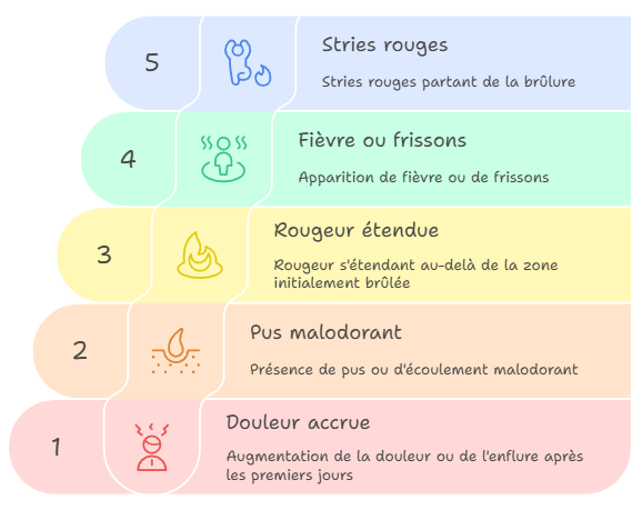 La prise en charge des brûlures graves doit toujours être confiée à des professionnels de santé. Ces brûlures peuvent nécessiter des soins spécialisés, des greffes de peau et une surveillance étroite pour prévenir les complications comme les infections systémiques, les cicatrices hypertrophiques ou les rétractions limitant la mobilité.