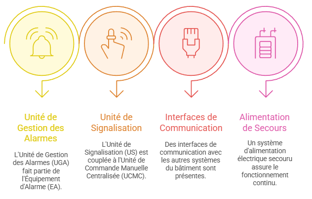 L’UGA pilote les diffuseurs sonores permettant d’alerter les occupants et de coordonner l’évacuation. Cette composante s’avère cruciale pour guider efficacement les personnes vers les sorties de secours où interviennent les guides files et serres files. De son côté, l’ensemble US/UCMC assure la commande et la signalisation des équipements de compartimentage et de désenfumage, limitant ainsi la propagation du feu et des fumées.
