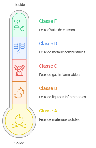 Tout d’abord, le type de feu que vous êtes susceptible de rencontrer détermine largement le modèle d’extincteur à privilégier. Les feux sont classés par catégories :