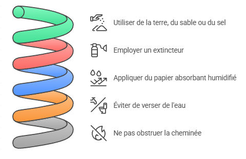 - Évitez absolument de verser de l’eau directement sur les flammes