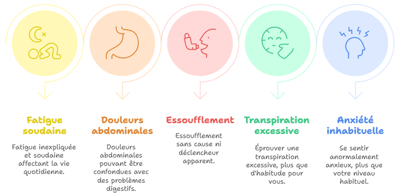 Les femmes, par exemple, peuvent présenter des symptômes différents de ceux habituellement décrits chez les hommes :